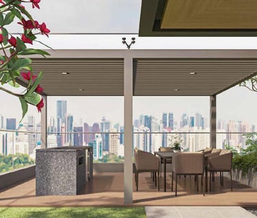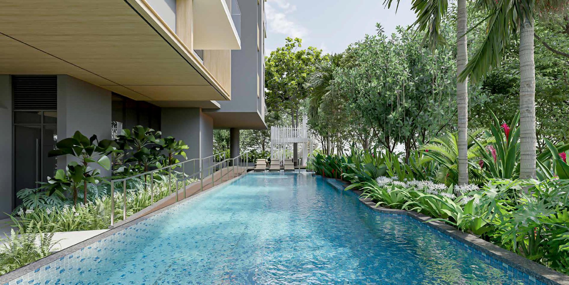 Revel in the splendour of nature. Just next to the kid’s pool, an artistic sculptural pavilion wraps around an impressive feature tree that rises above the green surrounds